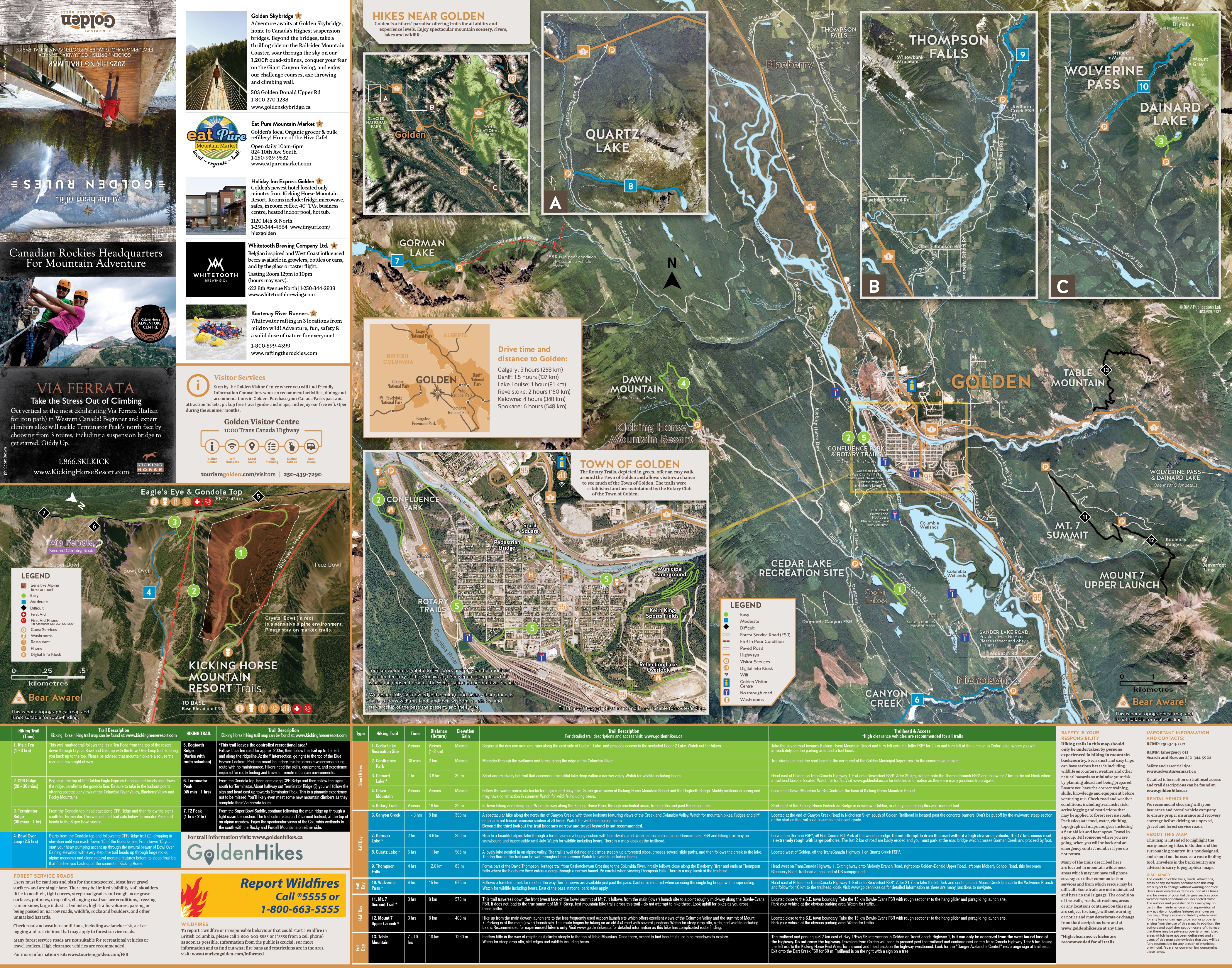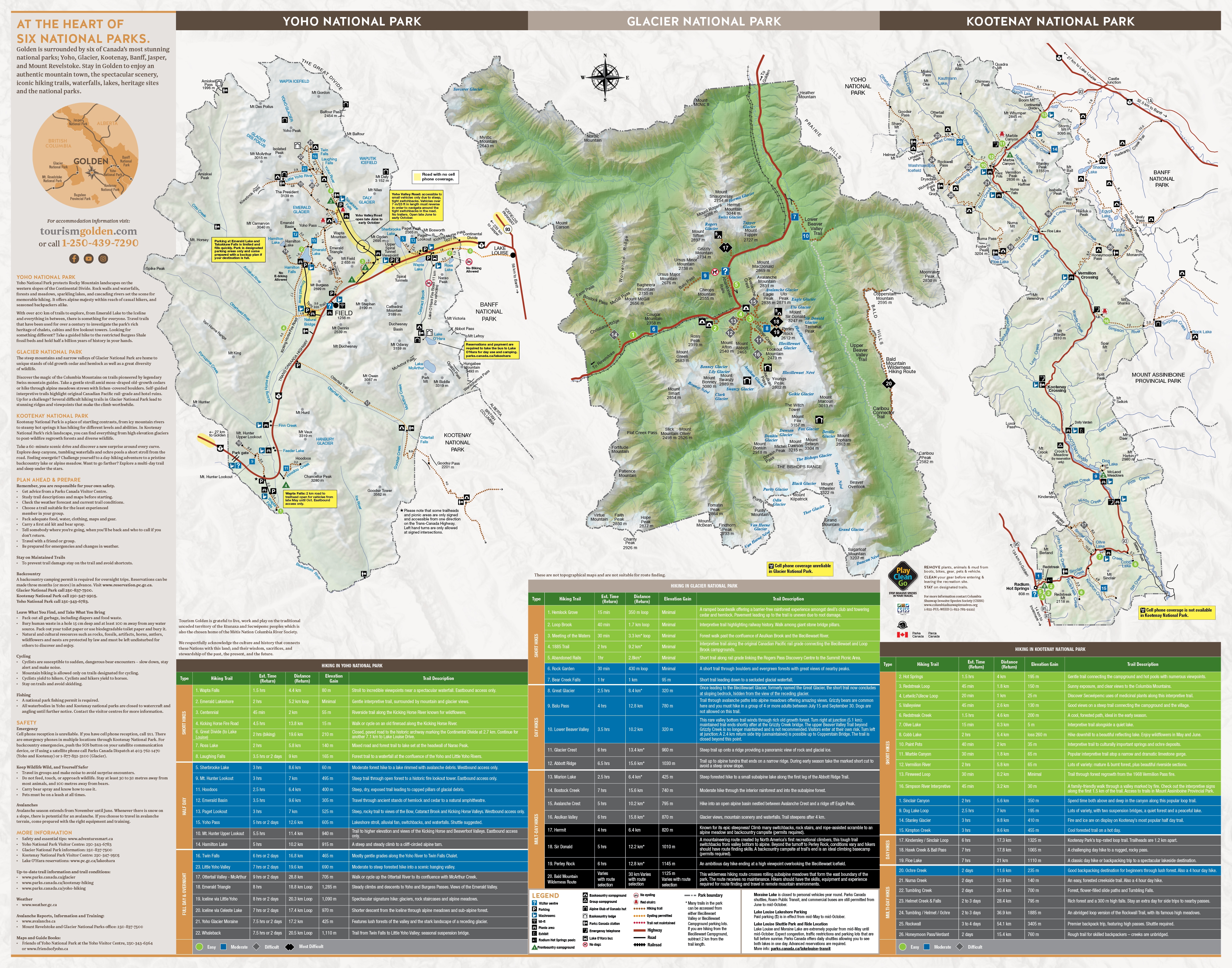 The Golden Hiking Map features hiking trails around Golden, at Kicking Horse Mountain Resort, Yoho, Glacier and Kootenay National Parks.